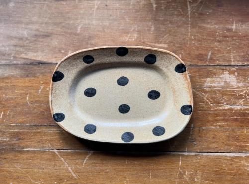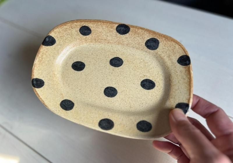やわらかなフォルムに、手仕事で描かれたドットが愛らしいサニークラフトのリム長皿。