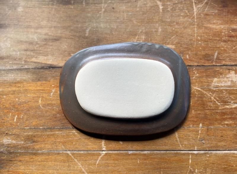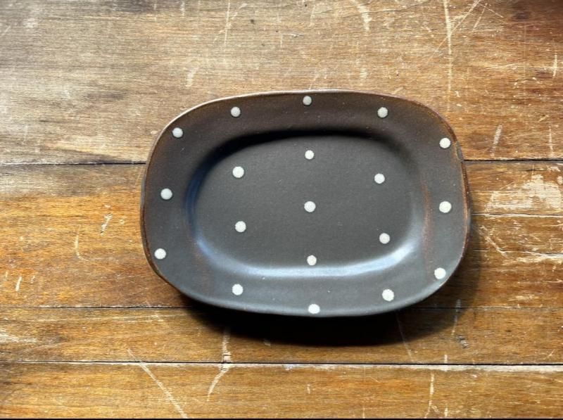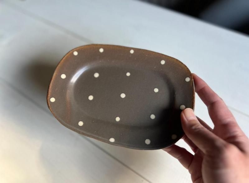 やわらかなフォルムに、手仕事で描かれたドットが愛らしいサニークラフトのリム長皿。
